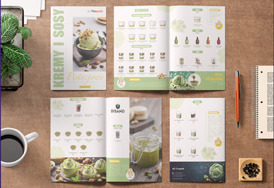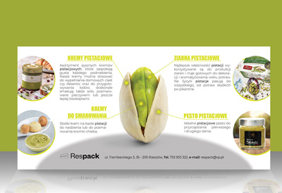 Projekt prostej broszury (katalogu?) produktowego dla firmy respack. Skromne 6 stron z przeznaczeniem do wysyłki mailowej. Katalog z sosami pistacjowymi w kolorystyce pistacji - swoją drogą nawiązujący również do opracowanej wcześniej ulotki o tej samej tematyce. Ciekawostki to moja inwencja twórcza na zapchanie wolnych przestrzeni - chyba wyszło ok, bo i klient zadowolony z efektu. A sam "ciakawostek" trochę rozwesela czytelnika.