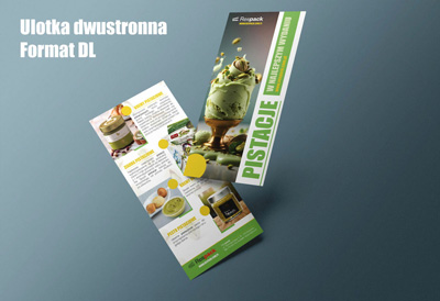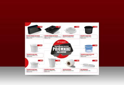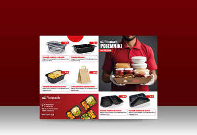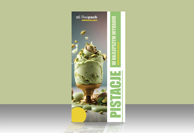 Projekt dwóch prostych ulotek A4 składanych do A5. Ulotka miała prezentować wybrane produkty firmy Respack. Kolorystyka nawiązująca do kolorystyki logo / strony WWW. Kolejna wersja (niestety dość mocno „napchana” produktami) złoto-beżową kolorystyką nawiązuje do tematyki ślubnej, komunijnej, chrztów (ulotka o tematyce tortów oraz dodatków do nich). Przy każdej z ulotek dla ułatwienia zamówienia dodane ID produktu lub oznaczenie kolumn i wierszy.