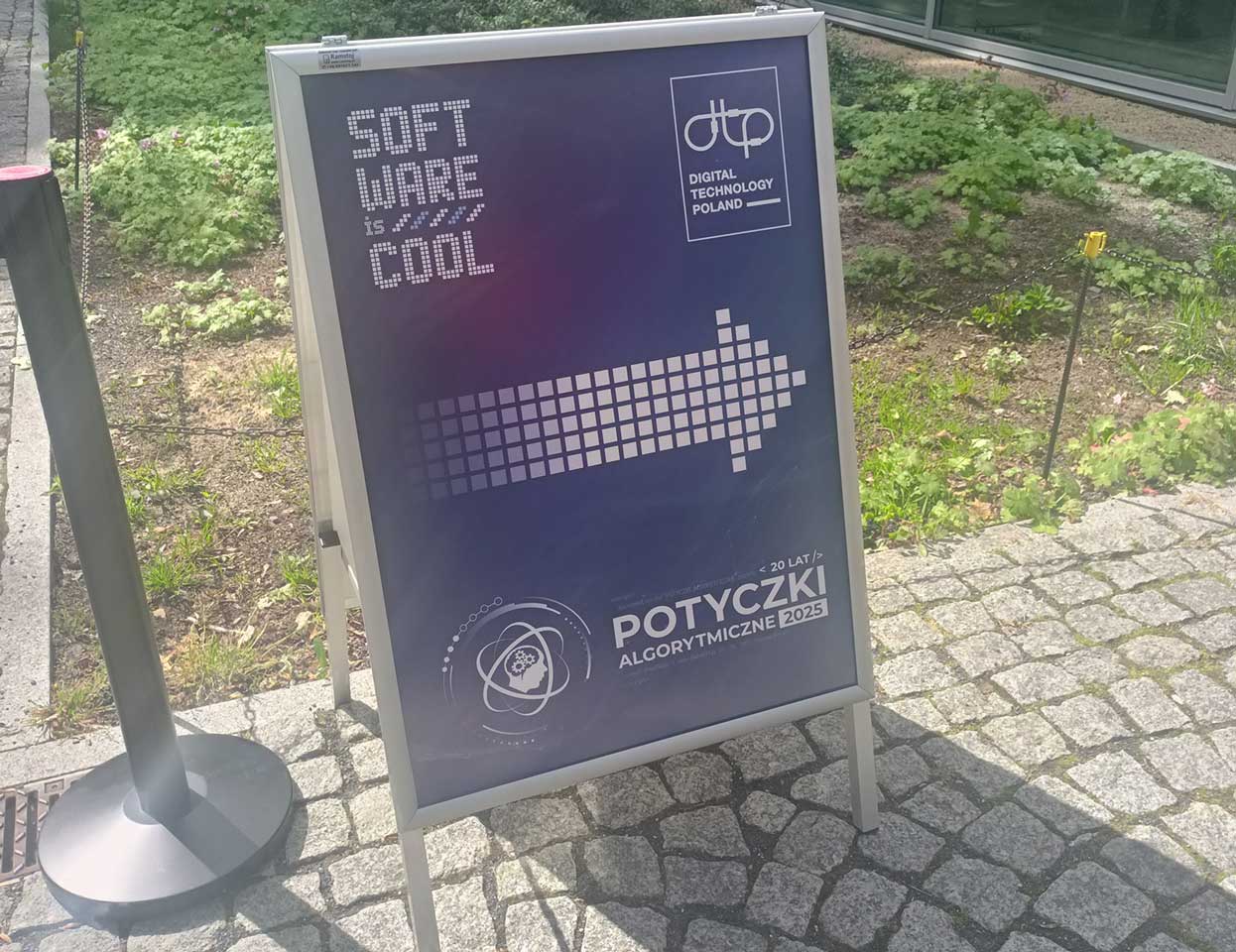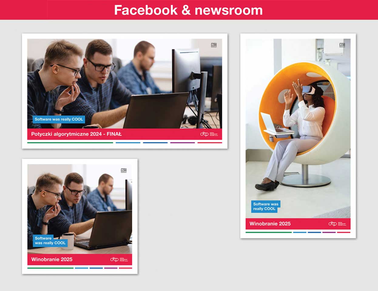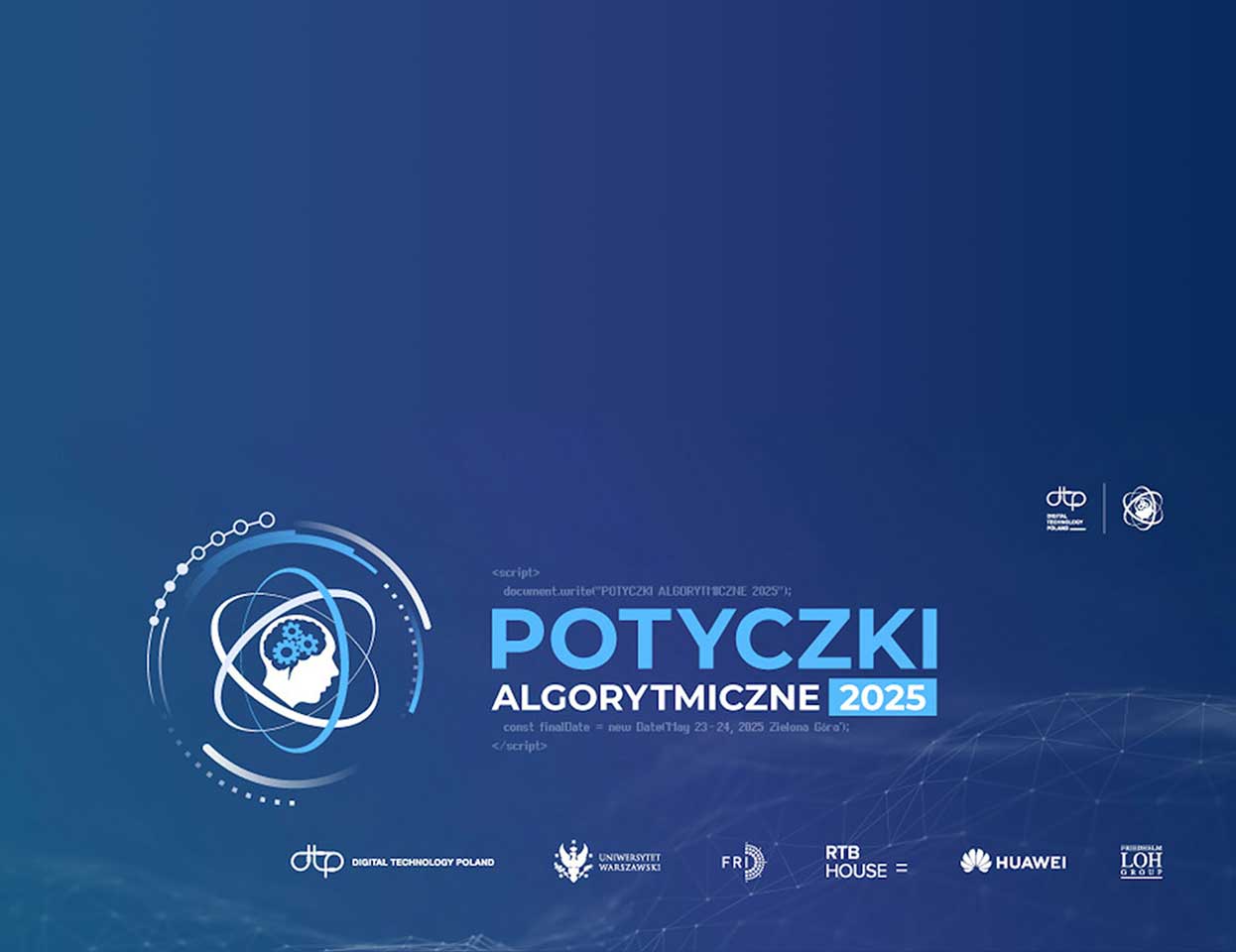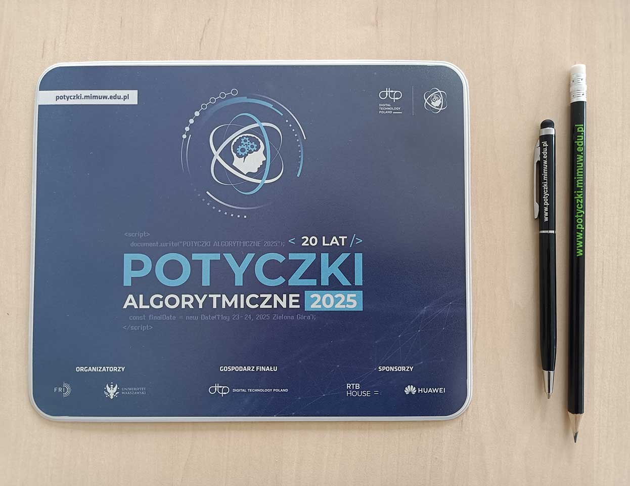 Opracowane tegorocznej (2025) "identyfikacji / oprawy wizualnej" dla ogólnopolskiego konkursu programistycznego "Potyczki Algorytmiczne". W tym roku logo potyczek algorytmicznych umieściłem w kole symbolizującym pasek postępu, ładowania. Jako e jest to konkurs programistyczny do logo dodałem niewielki akcent programistyczny - nazwa oraz data i lokalizacja konkursu zapisane w kodzie JavaScript. W tle grafiki delikatna falująca siatka - symbolizująca sieć neuronową - takie nawiązanie do modnego aktualnie AI. Na podstawie główne grafiki (po lewej) opracowane zostały pozostałe materiały (plakaty, rollupt, podkłądki pod mysze, posty na Facebook oraz instagram).